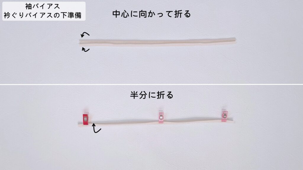 袖バイアス・衿ぐりバイアスは長辺側の両端をアイロンで中心に向かって折り、さらに半分に折ります。